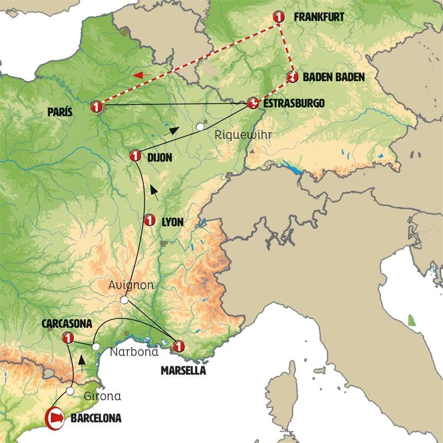 ¡Bienvenidos a su circuito de Europamundo!Viajamos hacia el norte de Cataluña. GERONA, tiempo en esta ciudad con magnífico casco histórico dominado por construcciones medievales y reminiscencias romanas, árabes y hebreas. Sugerimos visite la Catedral de Santa María, impresionante edificio gótico en la parte alta de la ciudad, y el antiguo barrio Judío con sus calles estrechas y pintorescas. Continuamos hacia la pequeña ciudad medieval de BESALÚ y tiempo para almorzar y pasear por sus callejas, su impresionante puente de piedra fortificado, su castillo, los baños judíos y el antiguo hospital de peregrinos. Tras la hora del almuerzo continuamos hacia la Cataluña francesa. COLLIURE, es una pequeña población costera llena de encanto, su playa, su puerto, sus callejas y su impresionante castillo construido sobre un antiguo castrum romano alojo la corte de los reyes de mallorca. Si lo desea puede ver la tumba del poeta Antonio Machado. Al final de la tarde llegada a CARCASONA, considerada la ciudad mejor amurallada de Europa. Sugerimos acercarse para ver las murallas iluminadas por la noche y cenar en alguno de sus cientos de pequeños restaurantes en “la cité”.