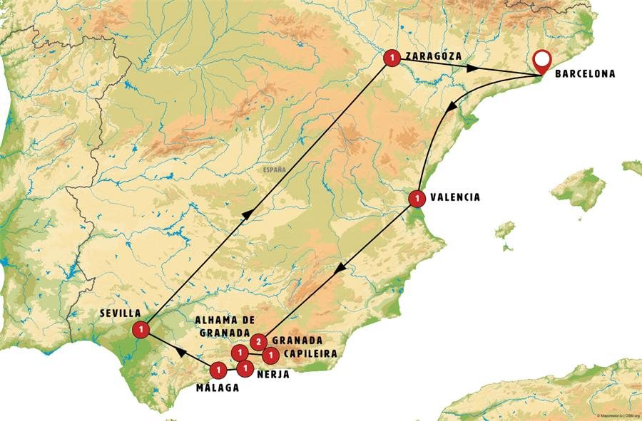 Salida hacia CÓMPETA, conocida como la «Cornisa de la Costa del Sol». Este encantador pueblo, con calles empedradas, casas blancas y vistas panorámicas de las montañas y el mar Mediterráneo, es un verdadero tesoro para los amantes de la naturaleza y la cultura. Continuaremos por la Costa Tropical, zona protegida de los vientos del norte por la barrera montañosa, donde se cultivan aguacates, chirimoyas y mangos. Llegada a ALMUÑÉCAR, ciudad con más de 3.000 años de historia con importantes vestigios las distintas culturas que por allí han pasado; fundada por los fenicios como "Sexi", conoceremos el acueducto romano y el castillo árabe. Tiempo libre para almorzar; os sugerimos probar el “pescaito frito”. Finalmente, nos dirigiremos a NERJA, famosa por sus casas blancas encaladas, su balcón sobre el Mediterráneo y sus playas cristalinas.