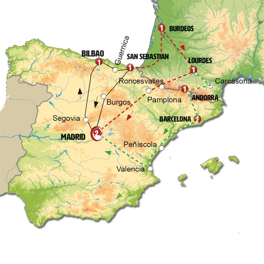 Salida temprano de Lourdes. Hoy atravesamos la cordillera de los Pirineos entre altas cumbres con muy hermosos paisajes. Entrando en España, pararemos a tomar un café en SALLENT DE GÁLLEGO, pueblo histórico de montaña con su iglesia gótica y su puente de piedra medieval. Seguimos a ZARAGOZA, la activa capital de Aragón. Tiempo para almorzar y conocer su barrio histórico y descubrir la gran Plaza del Pilar, con la catedral y la basílica donde se encuentra la venerada Virgen del Pilar. Continuación hacia MADRID. Llegada sobre las 21.00 h.