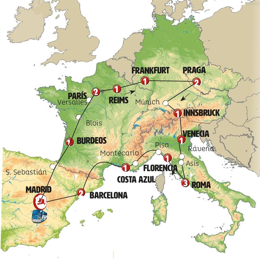 Viajamos hacia BÉLGICA. Paramos en BOUILLON, pintoresca población donde destaca el inmenso castillo de Godofredo de Bouillon. Continuamos a LUXEMBURGO, capital europea junto a grandioso barranco. Tiempo para dar un paseo y almorzar. Paso a ALEMANIA. FRANKFURT, llegada al final del día, breve paseo por el centro.