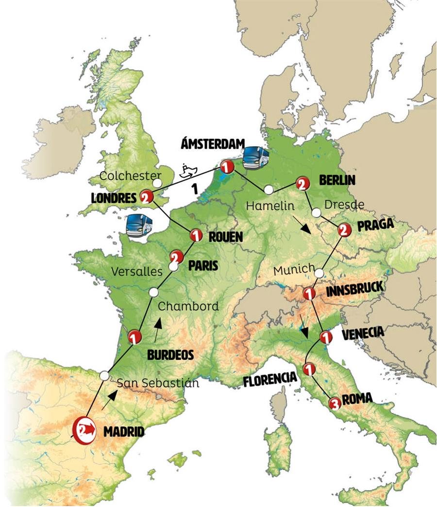 Paradas en Ruta: este circuito admite la posibilidad de que usted pueda programar una o más paradas en su viaje, en la ciudad que desee por período de 1, 3, 4 o 7 noches según circuito y fechas de salida. Es fundamental que el circuito tenga salida posterior a la fecha escogida y permita la salida deseada. El suplemento por parada efectuada es de 40 Euros/52 Dólares por persona. Si la parada se realiza para tomar otro circuito del mismo proveedor no se abonará este suplemento.