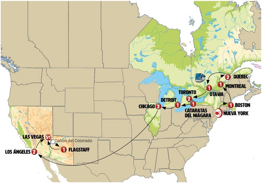 Salimos de Los Angeles y nos dirigimos a Las Vegas, Nevada. Llegada y en la tarde incluimos un paseo por el Downtown y el famoso Strip, la avenida donde se levantan los hoteles, casinos y espectáculos que han convertido a esta ciudad en un auténtico parque temático para adultos. Por la noche ofreceremos opcionalmente Noche de Luces en Las Vegas.Nota: esta etapa puede operar en bus de línea regular.