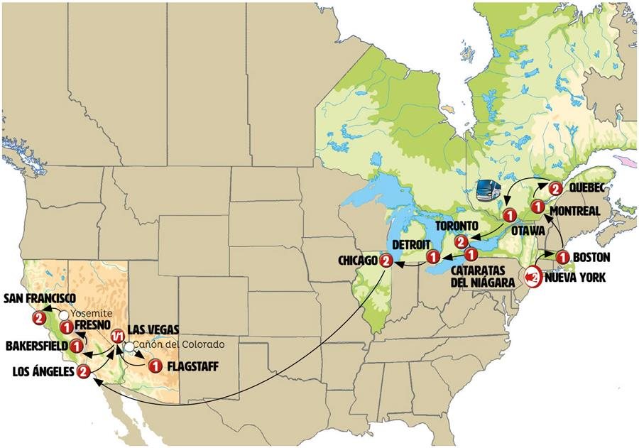 Salimos de Los Angeles y nos dirigimos a Las Vegas, Nevada. Llegada y en la tarde incluimos un paseo por el Downtown y el famoso Strip, la avenida donde se levantan los hoteles, casinos y espectáculos que han convertido a esta ciudad en un auténtico parque temático para adultos. Por la noche ofreceremos opcionalmente Noche de Luces en Las Vegas.Nota: esta etapa puede operar en bus de línea regular.
