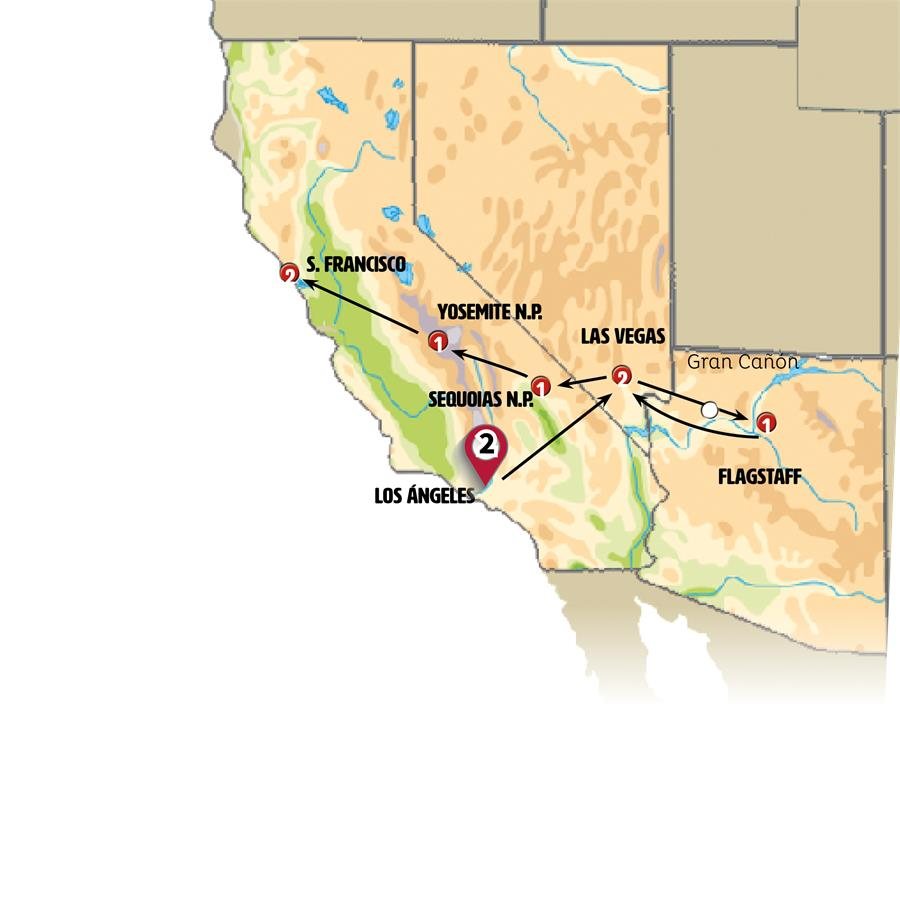 Salimos de Los Angeles y nos dirigimos a Las Vegas, Nevada. Llegada y en la tarde incluimos un paseo por el Downtown y el famoso Strip, la avenida donde se levantan los hoteles, casinos y espectáculos que han convertido a esta ciudad en un auténtico parque temático para adultos. Por la noche ofreceremos opcionalmente Noche de Luces en Las Vegas.Nota: esta etapa puede operar en bus de línea regular.