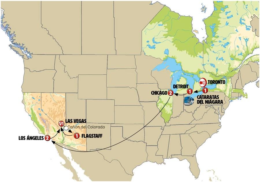 Salimos de Los Angeles y nos dirigimos a Las Vegas, Nevada. Llegada y en la tarde incluimos un paseo por el Downtown y el famoso Strip, la avenida donde se levantan los hoteles, casinos y espectáculos que han convertido a esta ciudad en un auténtico parque temático para adultos. Por la noche ofreceremos opcionalmente Noche de Luces en Las Vegas.Nota: esta etapa puede operar en bus de línea regular.