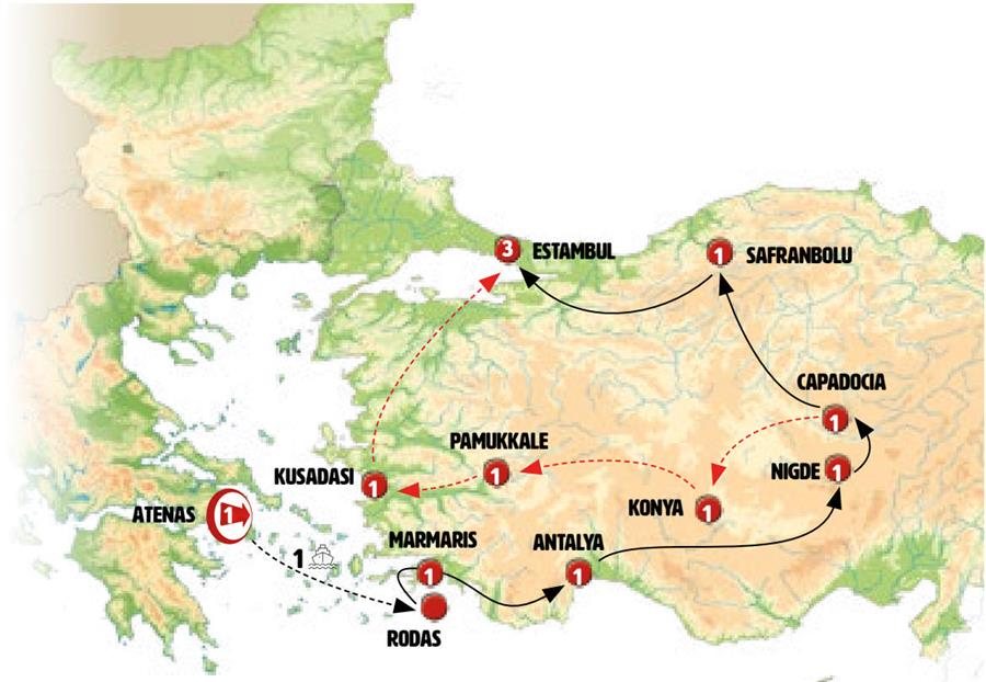 Llegada a Rodas al inicio de la mañana. Incluimos una visita de la ciudad con su impresionante ciudadela amurallada, su casco antiguo que nos muestra las huellas de las diferentes culturas que la habitaron (griegos, romanos, bizantinos, caballeros de San Juan, otomanos, italianos...). Por la tarde, sobre las 16.00 hrs, embarcamos en ferry rápido hacia TURQUÍA. Travesía de una hora. MÁRMARIS, bellísimo enclave turístico costero con su castillo, su marina y sus fuentes. Alojamiento en la región de Mármaris y Cena incluida. NOTA IMPORTANTE: Los ferris que comunican Rodas con Mármaris sufren modificaciones de horarios con frecuencia y no operan todos los días (excepto meses de verano), el itinerario podrá ser adaptado en base a las frecuencias existentes durante su viaje.