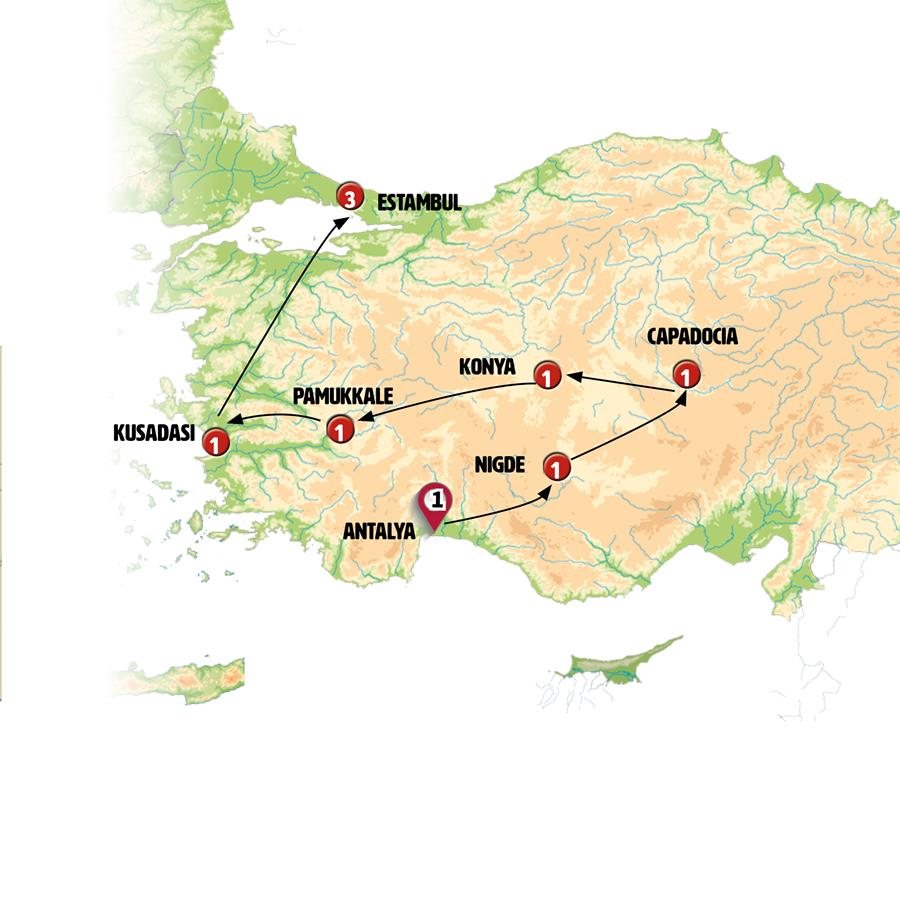 Bienvenidos a Turquía. Bienvenidos a ANTALYA. Traslado al hotel y tiempo libre. Recibirá información para el inicio de su circuito a través de los carteles informativos localizados en la recepción del hotel.A primera hora de la tarde haremos una breve visita de esta gran ciudad costera de más de un millón de habitantes, la puerta de Adriano, el barrio otomano y su gran cascada que cae directa al mar. Cena incluida.