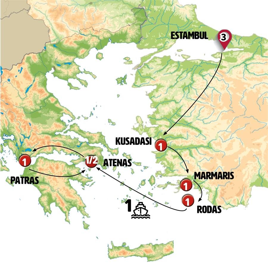 Incluimos excursión para conocer la isla de Rodas, viajamos a FILERIMOS, en lo alto de la colina, entre magníficos paisajes podrá usted conocer su pequeño monasterio. Tras ello viajamos a LINDOS, su fortaleza medieval y Acrópolis Griega dominan el mar, podrá pasear por las blancas y comerciales calles del centro, descansar en sus playas o subir (en burro si lo desea) a la Acrópolis. A la hora prevista embarcamos en el puerto de Rodas con destino a Atenas.