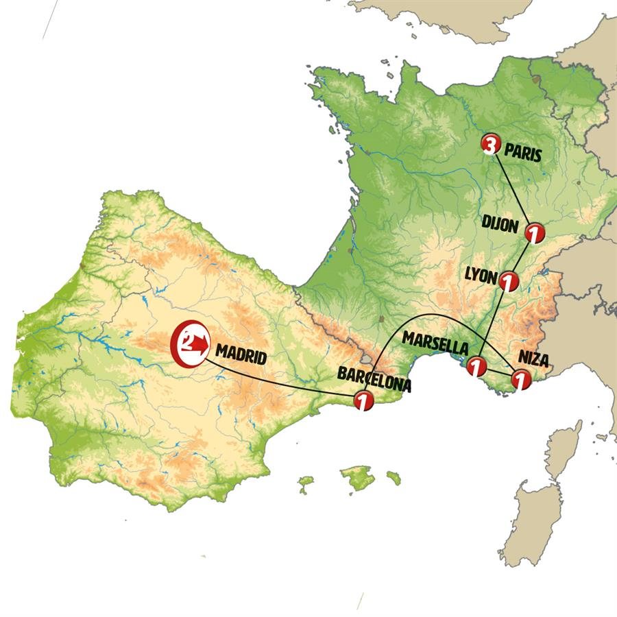 Tiempo libre en BARCELONA, podrá usted caminar por el Barrio Gótico, Las Ramblas y visitar la catedral. A las 12:00 h salimos hacia Francia y la Costa Azul atravesando la Provenza francesa. Parada en ruta para almorzar. Continuación a NIZA, llegada al final del día.Nota: En algunas fechas el alojamiento podrá ser efectuado en un punto próximo a Niza en la Costa Azul.