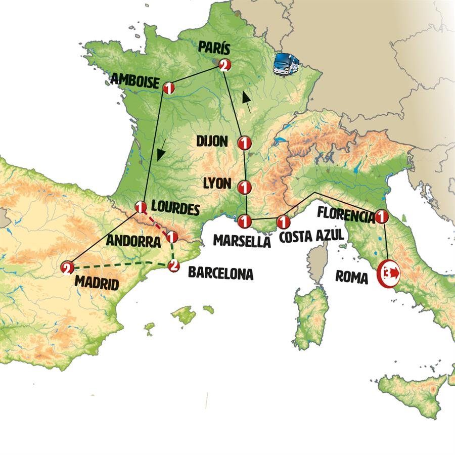 Paradas en Ruta: este circuito admite la posibilidad de que usted pueda programar una o más paradas en su viaje, en la ciudad que desee por período de 1, 3, 4 o 7 noches según circuito y fechas de salida. Es fundamental que el circuito tenga salida posterior a la fecha escogida y permita la salida deseada. El suplemento por parada efectuada es de 40 Euros/52 Dólares por persona. Si la parada se realiza para tomar otro circuito del mismo proveedor no se abonará este suplemento.