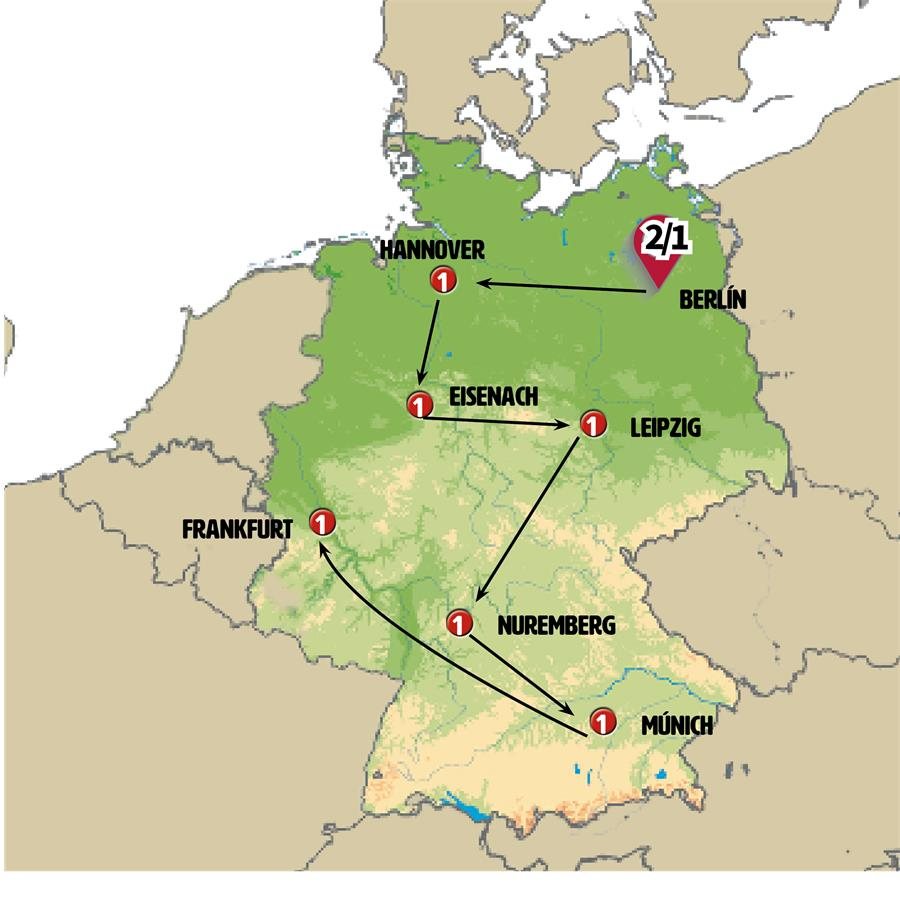 Comenzamos el día visitando el impresionante CASTILLO DE WARTBURG (entrada incluida), declarado Patrimonio de la Humanidad por la UNESCO, donde Martín Lutero tradujo el Nuevo Testamento al alemán. Tras ello, en EISENACH. Posteriormente, tendremos tiempo libre para almorzar y pasear en la ciudad para que, si le gusta la música, pueda visitar la casa de Bach o bien conocer el museo del automóvil donde podrá ver múltiples vehículos antiguos.Continuamos hacia GOTHA, donde podremos admirar su inmenso palacio barroco (visita exterior) y su clásico casco antiguo. En ERFURT, la capital de Turingia, exploraremos una ciudad llena de vida, con su gran catedral y su casco antiguo que incluye un precioso puente medieval habitado desde hace más de 500 años.Llegaremos al final de la tarde a LEIPZIG, una de las ciudades más ricas en historia y cultura de Alemania, donde vivieron los músicos Bach y Wagner, gran centro industrial durante la época de la RDA y que en la actualidad cuenta con más de medio millón de habitantes