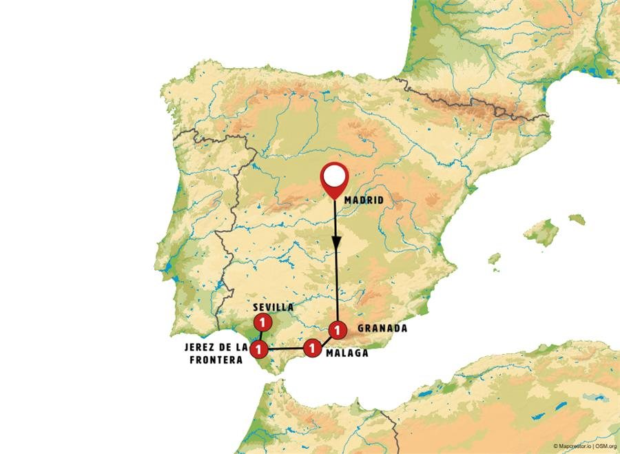 Hoy disfrutaremos de una de las etapas más hermosas del viaje, recorriendo los Pueblos Blancos y las serranías andaluzas. Partimos hacia PUERTO BANÚS en Marbella, uno de los puertos deportivos más lujosos de España, famoso por sus yates y boutiques de alta moda. Tras un paseo, seguimos hacia SETENIL DE LAS BODEGAS, espectacular pueblo blanco con casas incrustadas en la roca, y luego a RONDA, ciudad pintoresca situada sobre el desfiladero del Tajo. Almuerzo típico incluido y tiempo para un paseo antes de visitar la plaza de toros, una de las más antiguas y monumentales de España (entrada incluida). Llegada a JEREZ DE LA FRONTERA donde tendremos tiempo para pasear por el centro histórico y disfrutar de tapas en los "tabancos".