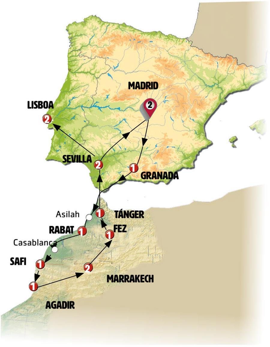 Salida de Granada. Atravesamos la Costa del Sol. En Algeciras o Tarifa embarcamos en moderno ferry cruzando el Estrecho de Gibraltar (ticket incluido). Normalmente el autocar no será embarcado debiendo llevar cada pasajero su equipaje. Llegada a Marruecos. Bonitos paisajes. ASILAH.- Pintoresca pequeña ciudad amurallada frente al Atlántico, fue un antiguo puerto de piratas, hoy la población tiene mucha vida. Tiempo para almorzar. Seguimos posteriormente hacia RABAT, llegada. Cena incluida.