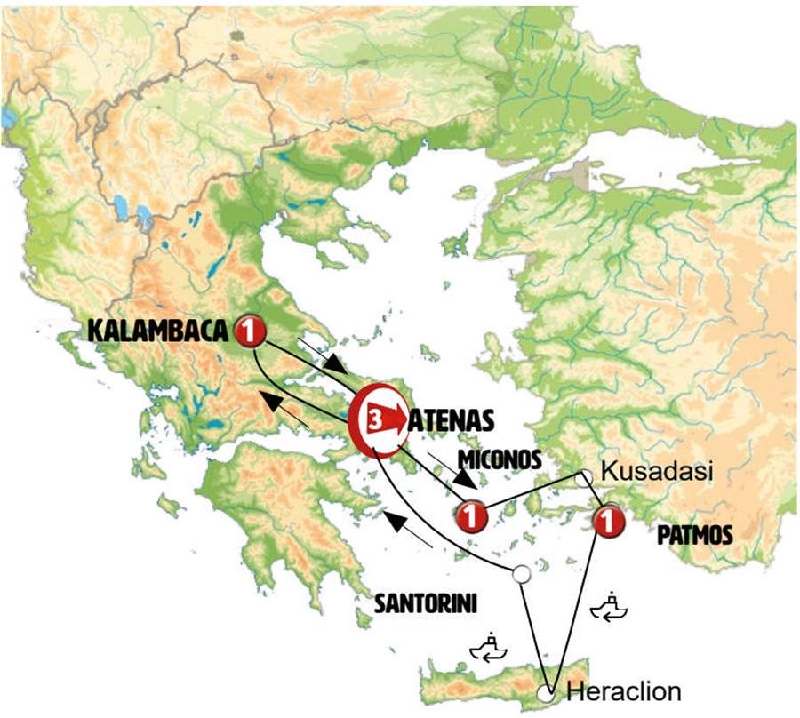 Llegada a primera hora de la mañana. Incluimos Visita panorámica de Atenas donde conocemos el Palacio Presidencial, el estadio Panatenaico donde se celebraron los primeros juegos olímpicos modernos, la biblioteca nacional, las bulliciosas plazas del centro; los nuevos barrios surgidos con las olimpiadas del 2004. Finalizamos en el recinto de la Acrópolis (entrada no incluida).