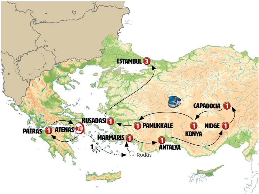 Llegada a Rodas al inicio de la mañana. Incluimos una visita de la ciudad con su impresionante ciudadela amurallada, su casco antiguo que nos muestra las huellas de las diferentes culturas que la habitaron (griegos, romanos, bizantinos, caballeros de San Juan, otomanos, italianos...). Por la tarde, sobre las 16.00 hrs, embarcamos en ferry rápido hacia TURQUÍA. Travesía de una hora. MÁRMARIS, bellísimo enclave turístico costero con su castillo, su marina y sus fuentes. Alojamiento en la región de Mármaris y Cena incluida. NOTA IMPORTANTE: Los ferris que comunican Rodas con Mármaris sufren modificaciones de horarios con frecuencia y no operan todos los días (excepto meses de verano), el itinerario podrá ser adaptado en base a las frecuencias existentes durante su viaje.