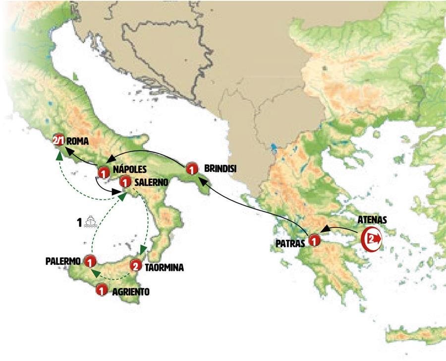 Tras el desayuno tomamos el puente de Rio Antirrio, espectacular puente colgante que conecta el Peloponeso con el continente griego. Viajamos por las regiones de Grecia Central y de Epiro. IGUMENITSA, llegada a esta ciudad portuaria. Tiempo para dar un paseo antes de tomar el moderno ferry (salida prevista a las 14.00 hrs) con el cual cruzamos el Mar Jónico hacia Italia. Llegada a BRINDISI al final del día (previsto a las 21.00 hrs). Alojamiento.