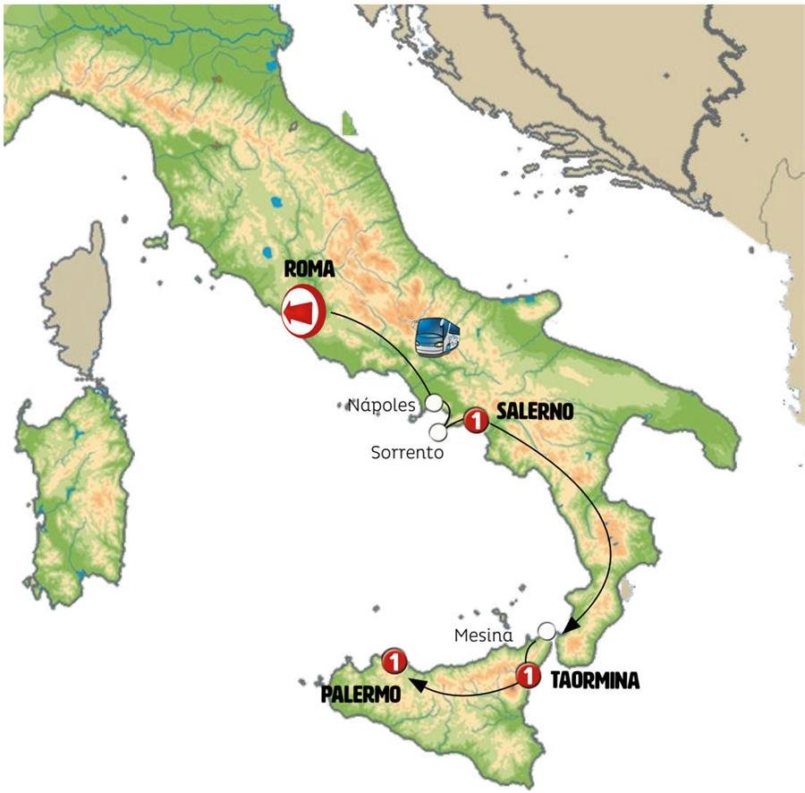 Viajamos hacia el sur de "la bota". Atractivos paisajes del sur de Italia atravesando el Parque Nacional de Cilento. Llegamos a PAOLA, a orillas del mar Tirreno, visitamos el santuario de San Francisco de Paola y tenemos tiempo libre para almorzar en su bonito centro histórico. Continuamos la ruta a VILLA SAN GIOVANNI donde embarcamos en corta travesía hacia la isla de SICILIA. Llegada a MESSINA en donde tendremos tiempo para dar un paseo junto a la catedral. Continuación a TAORMINA. Cena incluida.NOTA: Alojamiento en la "región de Taormina", en alguna fecha puntual el alojamiento podrá ser dado en Messina.