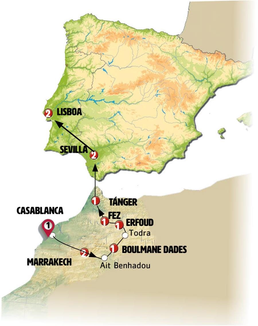 Salimos a cruzar el Atlas, elevadas cumbres frecuentemente nevadas nos saludan despidiendo el palmeral de Marrakech. Pequeños pueblos bereberes se cuelgan en los abismos. Conocemos el poblado fortificado de AIT BEN HADU, lugar donde se han rodado numerosas películas. Tanto en esta etapa como en la de mañana recorreremos los llamados paisajes bíblicos. Tiempo en OUARZAZATE ciudad con impresionante Kasbah. Continuamos hacia el Valle de las Rosas. BOUMALNE DADES. Cena incluida. Nota: En muy raras ocasiones (durante el invierno) pueden existir problemas de nieve en los pasos del Atlas; si la carretera por este motivo está cortada, se haría programa alternativo (llegando o no al Sahara según pasos alternativos de montaña cerrados).