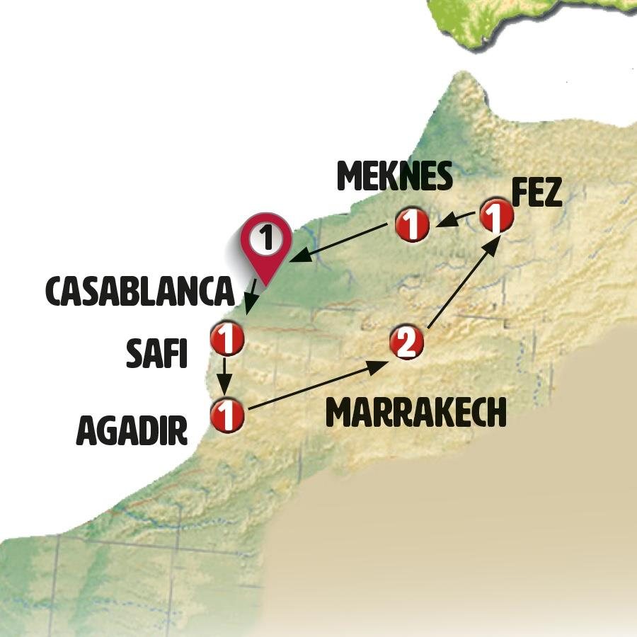 Esta mañana incluimos visita con guía local para conocer la mayor ciudad y centro económico de Marruecos. Recorreremos sus grandes avenidas, caminaremos por la hermosa plaza de Mohamed V con su fuente edificios moriscos palmeras y por el parque de la liga árabe. Conocemos también la pequeña Medina. Incluimos la entrada y visita a la enorme mezquita de Hassan II (la única mezquita de Marruecos donde se autoriza la entrada a no musulmanes), ubicada junto al mar, con su minarete de 210 metros de altura con luces laser en su parte superior que apuntan a la Meca. Tras ello un tiempo libre para almorzar en agradable zona marítima de “la corniche”.Tras la hora del almuerzo viajamos a EL JADIDA, su ciudadela (Mazagan) ha sido declarada Patrimonio de la Humanidad. Fue construido por los portugueses a principios del siglo XVI. Sus potentes murallas dominando el océano, sus pintorescas calles que conservan numerosas huellas de la época portuguesa -como la iglesia de la Asunción de estilo Manuelino-, pasearemos e incluiremos la entrada a la antigua cisterna del siglo XVI. Continuamos a SAFI, llegada al final de la tarde. Cena y alojamiento.Nota: la antigua cisterna de El Jadida se encuentra cerrada por restauración. Se prevé su reapertura a lo largo de la temporada.