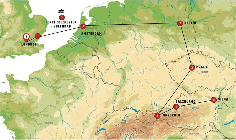 Por la mañana vamos al Museo Británico, uno de los principales y más antiguos museos del mundo, donde podremos ver las huellas de culturas de toda la tierra. Tiempo libre. A la hora del almuerzo daremos un traslado al barrio de CAMDEN, un distrito famoso por sus tiendas y mercados de sus calles en las que podremos ver objetos de culturas de todo el mundo y donde podrá almorzar en alguno de los múltiples pequeños restaurantes y puestos de comida de este popular barrio.Sobre las 16.00 saldremos hacia COLCHESTER, conocida como la más antigua ciudad de Inglaterra. Tiempo para pasear. Embarcamos posteriormente en Harwich en moderno ferry; travesía nocturna en camarotes con baño. Cena incluida.Nota importante: Debido a que el ferry utilizado tiene un número limitado de camarotes, en algunas ocasiones la etapa podrá sufrir modificaciones y se podrá ir desde Londres hasta Amsterdam bien en ferry diurno pernoctado en Amberes o bien en tren o avión a Amsterdam.