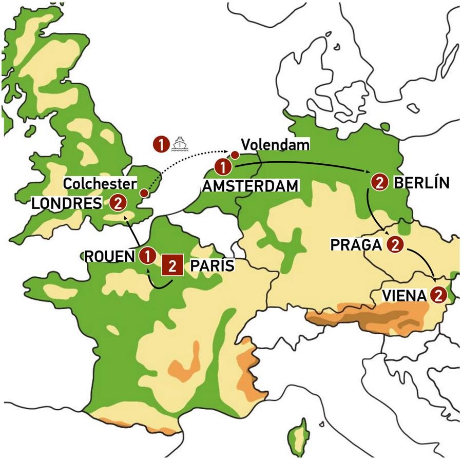 Por la mañana vamos al Museo Británico, uno de los principales y más antiguos museos del mundo, donde podremos ver las huellas de culturas de toda la tierra. Tiempo libre. A la hora del almuerzo daremos un traslado al barrio de CAMDEN, un distrito famoso por sus tiendas y mercados de sus calles en las que podremos ver objetos de culturas de todo el mundo y donde podrá almorzar en alguno de los múltiples pequeños restaurantes y puestos de comida de este popular barrio.Sobre las 16.00 saldremos hacia COLCHESTER, conocida como la más antigua ciudad de Inglaterra. Tiempo para pasear. Embarcamos posteriormente en Harwich en moderno ferry; travesía nocturna en camarotes con baño. Cena incluida.Nota importante: Debido a que el ferry utilizado tiene un número limitado de camarotes, en algunas ocasiones la etapa podrá sufrir modificaciones y se podrá ir desde Londres hasta Amsterdam bien en ferry diurno pernoctado en Amberes o bien en tren o avión a Amsterdam.