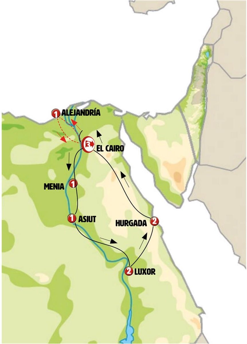 Iniciamos otra jornada apasionante en el centro del Valle del Nilo. Saliendo de Menia paramos en ZAWIYYET SULTAN, lugar de los muertos, al pie de pequeña necrópolis faraónica, un inmenso cementerio con una muy peculiar arquitectura de mausoleos abovedados de adobe nos lleva a sentirnos “en otro mundo”. Tras ello conocemos BENI HASSAN, la necrópolis se alzan en acantilados sobre el valle del Nilo, 39 tumbas (se visitan cuatro) que datan de 2125 a 1795 años antes de Cristo y nos ofrecen una fascinante idea de la vida diaria de aquella época. Almuerzo incluido.Siguiendo el valle del Nilo paramos en las TUMBAS DE MIR, con sus nueve tumbas del imperio antiguo y Medio abiertas a la visita. Impresiona la soledad del lugar (sin practicamente turismo). Próximo a las tumbas conocemos DEIR AL MUHARRAQ, monasterio y lugar de peregrinación copto. En una cueva de este lugar, los monjes indican que habitaron María y Jesús durante seis meses después de huir de Herodes. Según la tradición la iglesia se construyó alrededor del año 60 , siendo “la iglesia cristiana más antigua del mundo”.Continuación a ASSIUT, capital provincial. Cena incluida y alojamiento.