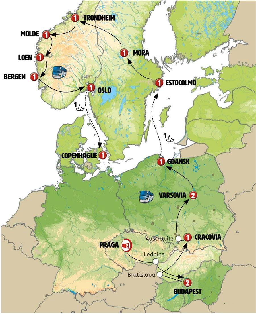 Tras un tiempo por el centro de Trondheim seguimos nuestra ruta, la etapa de hoy nos muestra la costa, fiordos junto al mar de Noruega, grandes paisajes. Uno de los fiordos lo atravesamos en ferry, hermosos paisajes. KRISTIANSUND, conocida por su hermoso entorno natural. La ciudad vivió tradicionalmente de la pesca, se encuentra en una serie de islas unidas por puentes y terraplenes, lo que le otorga un carácter distintivo. El centro de Kristiansund es encantador y cuenta con calles adoquinadas, tiendas, restaurantes y cafeterías. Tiempo para pasear y almorzar. Tras ello, entre muy bonitos paisajes conocemos la iglesia de madera de KVERNES (entrada incluida) del siglo XIV, con una increíble maqueta de un barco de 300 años de antigüedad y retablos de la Virgen Maria. Seguiremos la ATLANTIC ROAD, considerada como el tramo de carretera junto al océano más bonito de Noruega, ocho puentes conectan diferentes islotes, a veces el oleaje azota, paramos en uno de los miradores. MOLDE, llegada al final de la tarde a esta agradable población llena de vida, ubicada junto a su fiordo, lugar donde llegan cruceros turísticos.