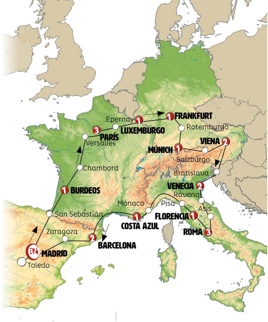 Paradas en Ruta: este circuito admite la posibilidad de que usted pueda programar una o más paradas en su viaje, en la ciudad que desee por período de 1, 3, 4 o 7 noches según circuito y fechas de salida. Es fundamental que el circuito tenga salida posterior a la fecha escogida y permita la salida deseada. El suplemento por parada efectuada es de 40 Euros/52 Dólares por persona. Si la parada se realiza para tomar otro circuito del mismo proveedor no se abonará este suplemento.