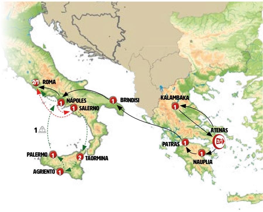 Tras el desayuno tomamos el puente de Rio Antirrio, espectacular puente colgante que conecta el Peloponeso con el continente griego. Viajamos por las regiones de Grecia Central y de Epiro. IGUMENITSA, llegada a esta ciudad portuaria. Tiempo para dar un paseo antes de tomar el moderno ferry (salida prevista a las 14.00 hrs) con el cual cruzamos el Mar Jónico hacia Italia. Llegada a BRINDISI al final del día (previsto a las 21.00 hrs). Alojamiento.