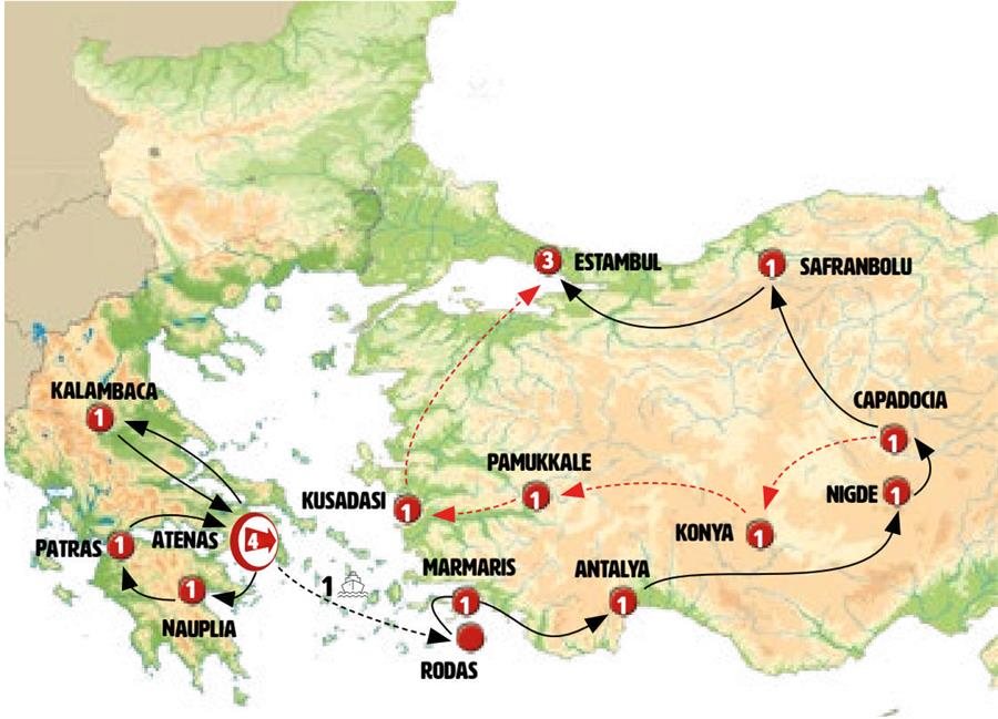 Llegada a Rodas al inicio de la mañana. Incluimos una visita de la ciudad con su impresionante ciudadela amurallada, su casco antiguo que nos muestra las huellas de las diferentes culturas que la habitaron (griegos, romanos, bizantinos, caballeros de San Juan, otomanos, italianos...). Por la tarde, sobre las 16.00 hrs, embarcamos en ferry rápido hacia TURQUÍA. Travesía de una hora. MÁRMARIS, bellísimo enclave turístico costero con su castillo, su marina y sus fuentes. Alojamiento en la región de Mármaris y Cena incluida. NOTA IMPORTANTE: Los ferris que comunican Rodas con Mármaris sufren modificaciones de horarios con frecuencia y no operan todos los días (excepto meses de verano), el itinerario podrá ser adaptado en base a las frecuencias existentes durante su viaje.
