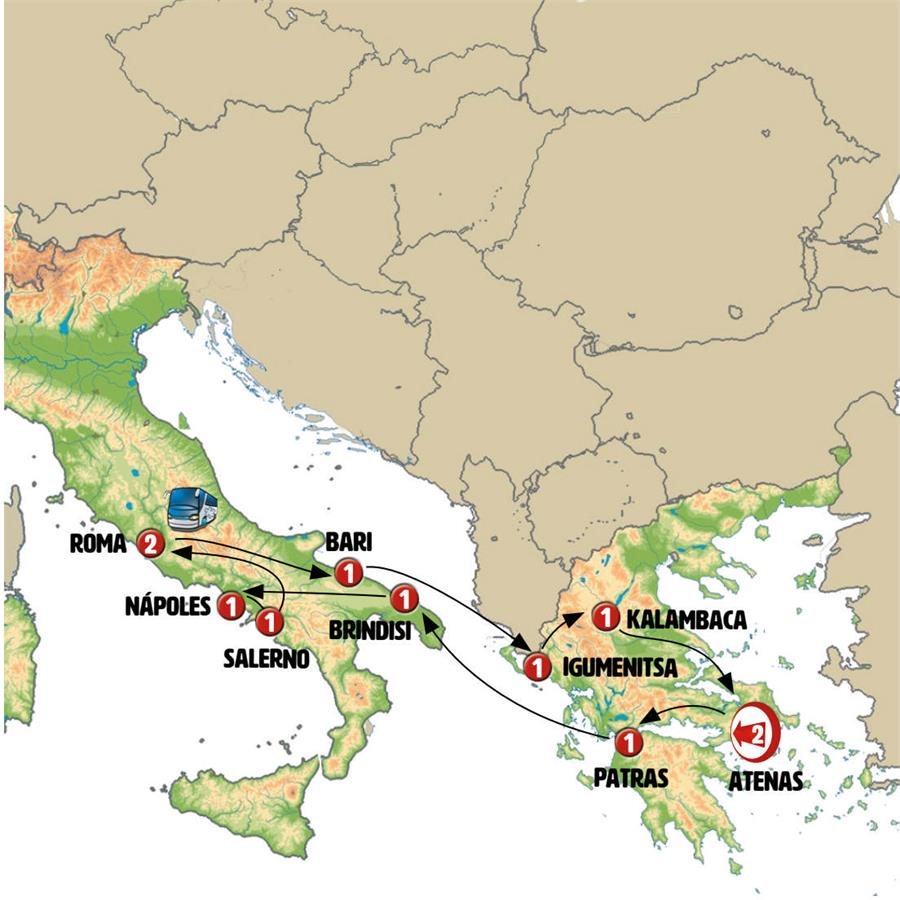 Tras el desayuno tomamos el puente de Rio Antirrio, espectacular puente colgante que conecta el Peloponeso con el continente griego. Viajamos por las regiones de Grecia Central y de Epiro. IGUMENITSA, llegada a esta ciudad portuaria. Tiempo para dar un paseo antes de tomar el moderno ferry (salida prevista a las 14.00 hrs) con el cual cruzamos el Mar Jónico hacia Italia. Llegada a BRINDISI al final del día (previsto a las 21.00 hrs). Alojamiento.