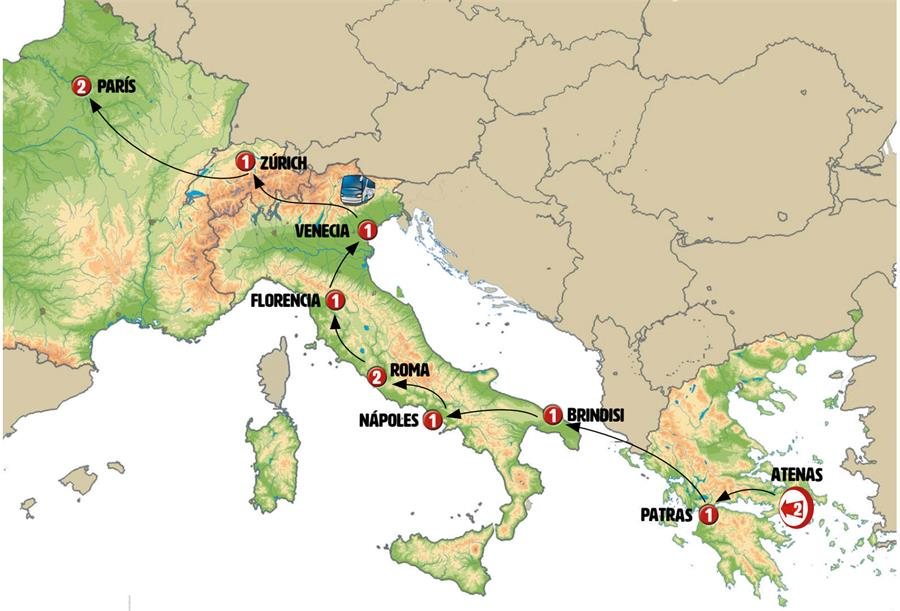 Paradas en Ruta: este circuito admite la posibilidad de que usted pueda programar una o más paradas en su viaje, en la ciudad que desee por período de 1, 3, 4 o 7 noches según circuito y fechas de salida. Es fundamental que el circuito tenga salida posterior a la fecha escogida y permita la salida deseada. El suplemento por parada efectuada es de 40 Euros/52 Dólares por persona. Si la parada se realiza para tomar otro circuito del mismo proveedor no se abonará este suplemento.