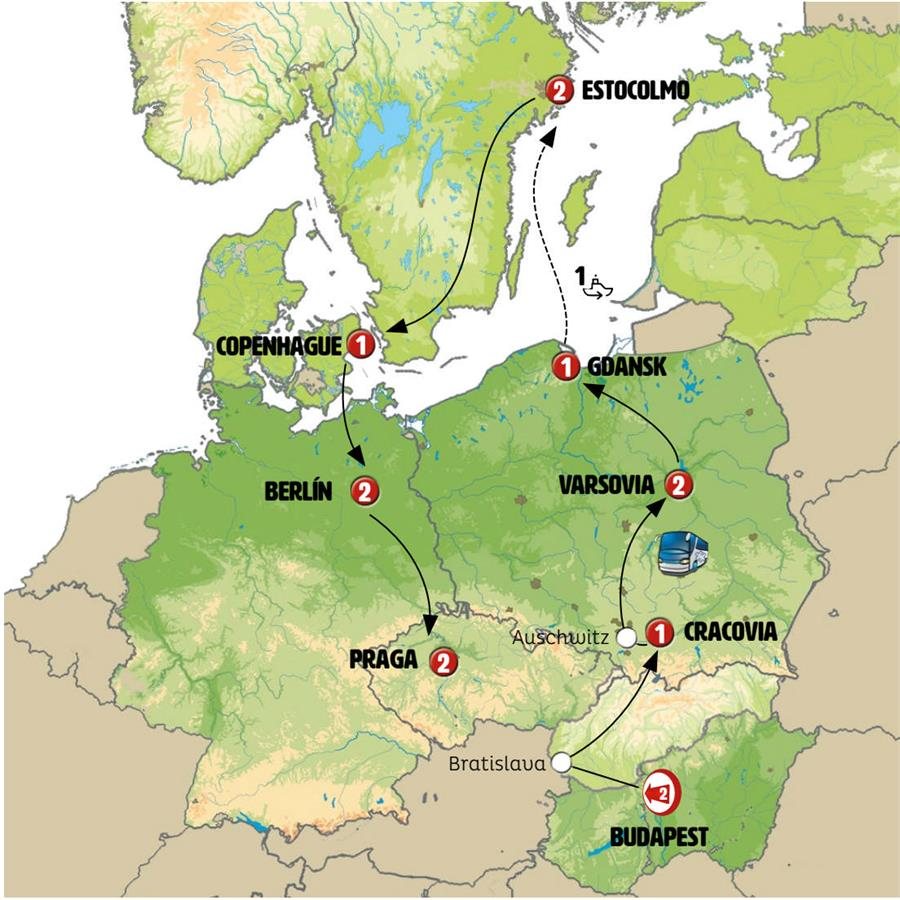 Por la mañana incluimos una visita panorámica con guía local de la capital danesa, ciudad conocida por su calidad de vida, respeto por la sostenibilidad y rica vida cultural. Conoceremos “La Sirenita”, el puerto de Nyhavn con sus edificios históricos coloridos, el exterior del Palacio de Amalienborg donde reside la familia real danesa, la plaza del ayuntamiento y la zona del parque Tivoli. Tras ello saldremos hacia el sur de Dinamarca. En GEDSER tomamos ferry, travesía de unas dos horas hacia Alemania. Llegada a Warnemunde continuación a BERLÍN, llegada al final del día.Nota: en el caso de que el número de pasajeros realizando el trayecto entre Copenhague/Berlín sea muy limitado, este podrá realizarse en línea regular de viajeros sin modificacarse el contenido de la etapa.