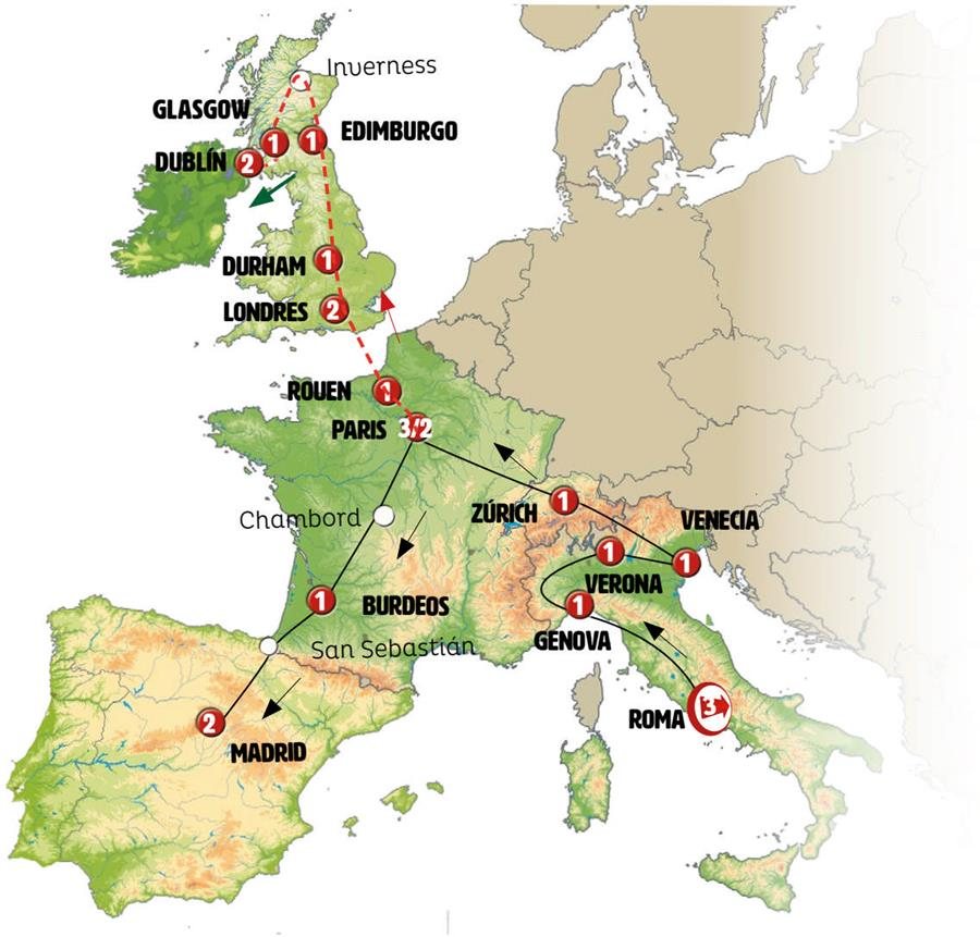 Paradas en Ruta: este circuito admite la posibilidad de que usted pueda programar una o más paradas en su viaje, en la ciudad que desee por período de 1, 3, 4 o 7 noches según circuito y fechas de salida. Es fundamental que el circuito tenga salida posterior a la fecha escogida y permita la salida deseada. El suplemento por parada efectuada es de 40 Euros/52 Dólares por persona. Si la parada se realiza para tomar otro circuito del mismo proveedor no se abonará este suplemento.