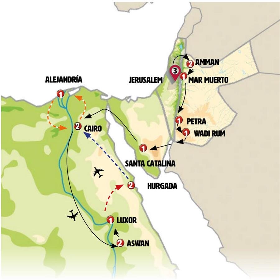 Tras el desayuno salimos a AQABA, la segunda ciudad Jordana, a orillas del Mar Rojo. Un paseo por el centro antes de seguir hacia la frontera de ISRAEL, EILAT, llegada a esta moderna y turística ciudad con sus excelentes playas. Un tiempo de relax para almorzar y pasear ¿se anima a bañarse? Antes de continuar hacia la frontera de EGIPTO. Paso al Sinai, en nuestra ruta fotografiamos la isla del faraón con la potente fortaleza de Saladino. Continuación hacia SANTA CATALINA. Llegada, cena incluida y alojamiento.NOTA: En el paso entre Jordania a Israel y de Israel a Egipto deben abonarse, por parte del viajero, unas tasas de entrada/salida en los diferentes países. Jordania: 15 $ (tasas de salida), Israel: 32 $ (tasa de salida), Egipto: Tasas de entrada a Taba: 25$, Visado de entrada: 45 $ (que en realidad son 25$ de visado + 20$ gastos de tramitación). Tasas aproximadas y sujetas a cambio sin previo aviso por las autoridades del país.Están prohibidos los drones y las cámaras con zoom de 5,5 metros así como otro tipo de cámaras de equipos profesionales ( Europamundo no se responsabiliza de los objetos que puedan ser requisados en las fronteras por parte de las autoridades de los países )NOTA IMPORTANTE: Debido a circunstancias excepcionales o a un número reducido de participantes, puede ocurrir que crucemos directamente de Jordania a Egipto en barco, tomando el FERRY AQABA- TABA con una duración de algo más de dos horas. Durante la travesía en ferry, no habrá asistencia de ningún guía.