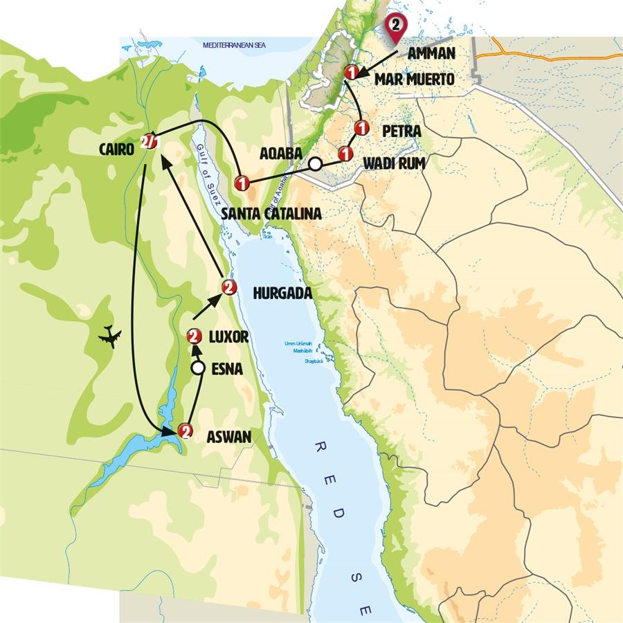 Tras el desayuno salimos a AQABA, la segunda ciudad Jordana, a orillas del Mar Rojo. Un paseo por el centro antes de seguir hacia la frontera de ISRAEL, EILAT, llegada a esta moderna y turística ciudad con sus excelentes playas. Un tiempo de relax para almorzar y pasear ¿se anima a bañarse? Antes de continuar hacia la frontera de EGIPTO. Paso al Sinai, en nuestra ruta fotografiamos la isla del faraón con la potente fortaleza de Saladino. Continuación hacia SANTA CATALINA. Llegada, cena incluida y alojamiento.NOTA: En el paso entre Jordania a Israel y de Israel a Egipto deben abonarse, por parte del viajero, unas tasas de entrada/salida en los diferentes países. Jordania: 15 $ (tasas de salida), Israel: 32 $ (tasa de salida), Egipto: Tasas de entrada a Taba: 25$, Visado de entrada: 45 $ (que en realidad son 25$ de visado + 20$ gastos de tramitación). Tasas aproximadas y sujetas a cambio sin previo aviso por las autoridades del país.Están prohibidos los drones y las cámaras con zoom de 5,5 metros así como otro tipo de cámaras de equipos profesionales ( Europamundo no se responsabiliza de los objetos que puedan ser requisados en las fronteras por parte de las autoridades de los países )NOTA IMPORTANTE: Debido a circunstancias excepcionales o a un número reducido de participantes, puede ocurrir que crucemos directamente de Jordania a Egipto en barco, tomando el FERRY AQABA- TABA con una duración de algo más de dos horas. Durante la travesía en ferry, no habrá asistencia de ningún guía.
