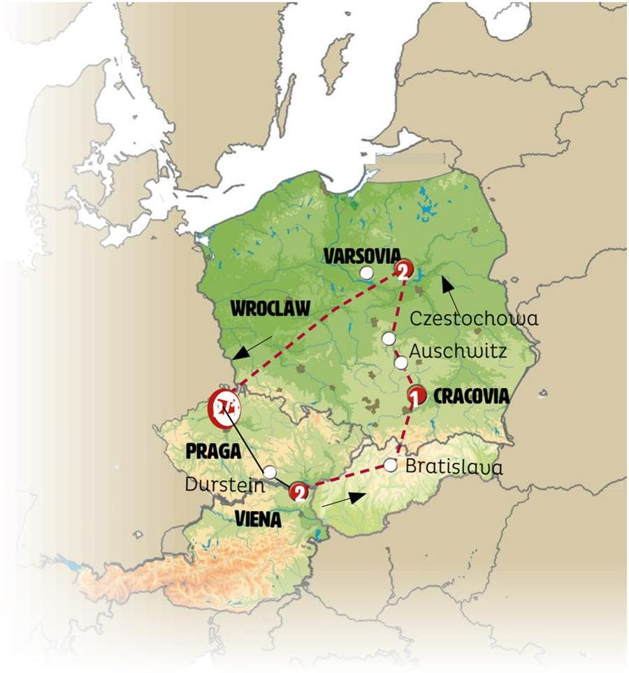 Por la mañana incluimos una visita panorámica con guía local de Cracovia, la capital de la "Pequeña Polonia" fundada en el s. VII, cuyo casco antiguo ha sido declarado Patrimonio de la Humanidad por la UNESCO. En nuestra visita conoceremos, además de sus bonitas calles medievales, la plaza del Mercado, una de las mayores de Europa y corazón de la ciudad y la colina del castillo de Wawel, antigua residencia de los reyes polacos. Tras la hora del almuerzo viajamos hacia AUSCHWITZ-BIRKENAU, el antiguo campo de concentración que nos recuerda ciertos momentos de la historia de Europa. Visitaremos el campo 2, Birkenau, donde llegaban los trenes procedentes de toda Europa. Posteriormente en CZESTOCHOWA, visitamos el Monasterio de Jasna Gora donde se encuentra la Virgen Negra, lugar de peregrinación muy concurrido. Llegada a VARSOVIA al final de la tarde.Nota: En ocasiones pueden existir dificultades para conseguir las entradas requeridas en Auschwitz, en estas ocasiones el programa puede ser modificado (normalmente entrando en el campo de concentración a una hora más tardía y visitando Wadovice en lugar de Czestochowa)