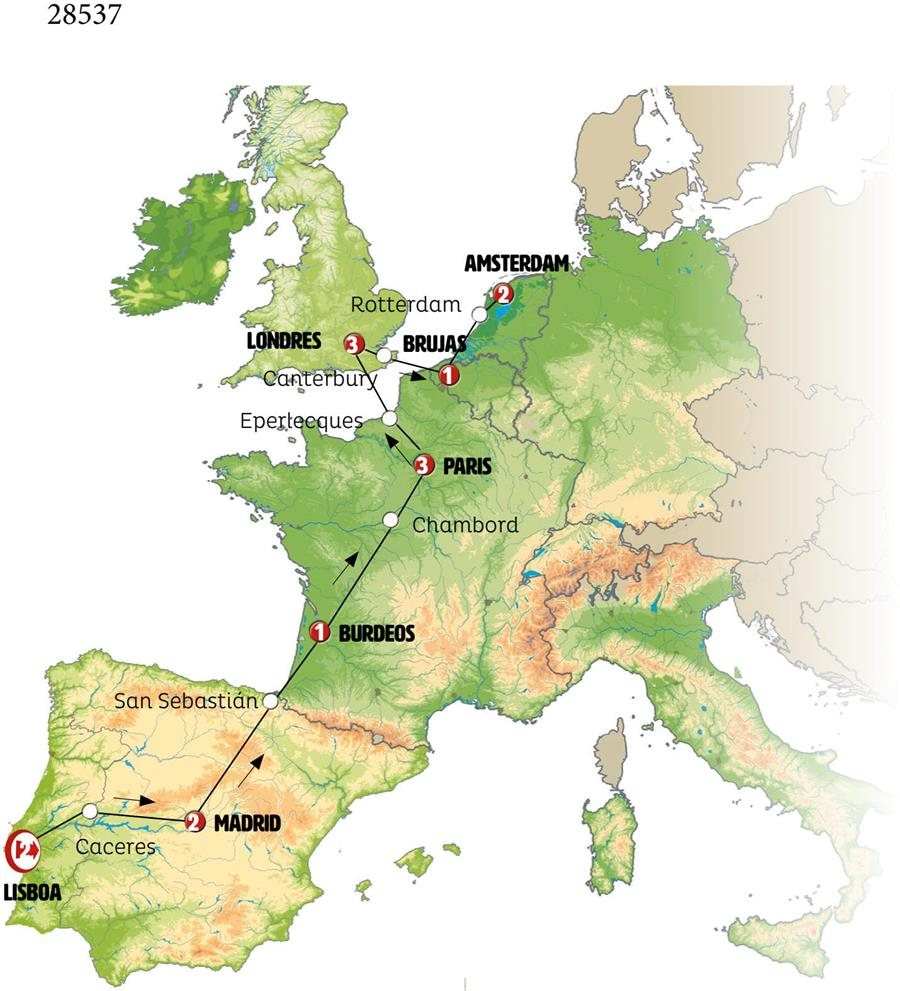 Saldremos de Londres, placidos paisajes de verdes colinas en el sur de Inglaterra. Tramites fronterizos antes de nuestro embarque hacia Calais. Agradable travesía en moderno ferry cruzando el Canal de la Mancha, ¡disfrute del ferry y del aire del oceano!. Llegada a Francia y continuacion hacia Bélgica. BRUJAS, la encantadora y mundialmente conocida ciudad flamenca de hermosos canales.