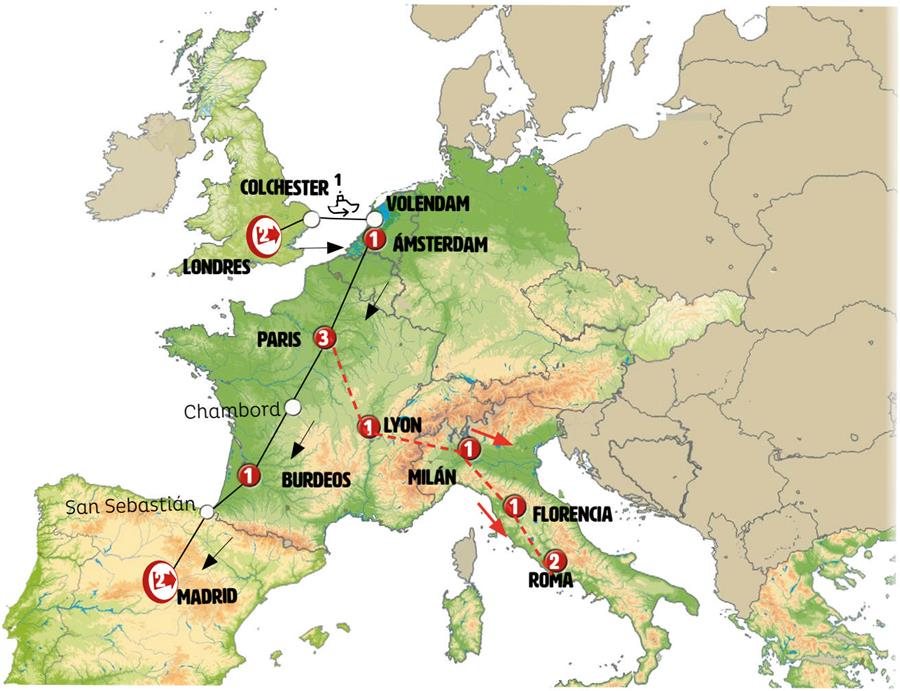 Por la mañana vamos al Museo Británico, uno de los principales y más antiguos museos del mundo, donde podremos ver las huellas de culturas de toda la tierra. Tiempo libre. A la hora del almuerzo daremos un traslado al barrio de CAMDEN, un distrito famoso por sus tiendas y mercados de sus calles en las que podremos ver objetos de culturas de todo el mundo y donde podrá almorzar en alguno de los múltiples pequeños restaurantes y puestos de comida de este popular barrio.Sobre las 16.00 saldremos hacia COLCHESTER, conocida como la más antigua ciudad de Inglaterra. Tiempo para pasear. Embarcamos posteriormente en Harwich en moderno ferry; travesía nocturna en camarotes con baño. Cena incluida.Nota importante: Debido a que el ferry utilizado tiene un número limitado de camarotes, en algunas ocasiones la etapa podrá sufrir modificaciones y se podrá ir desde Londres hasta Amsterdam bien en ferry diurno pernoctado en Amberes o bien en tren o avión a Amsterdam.