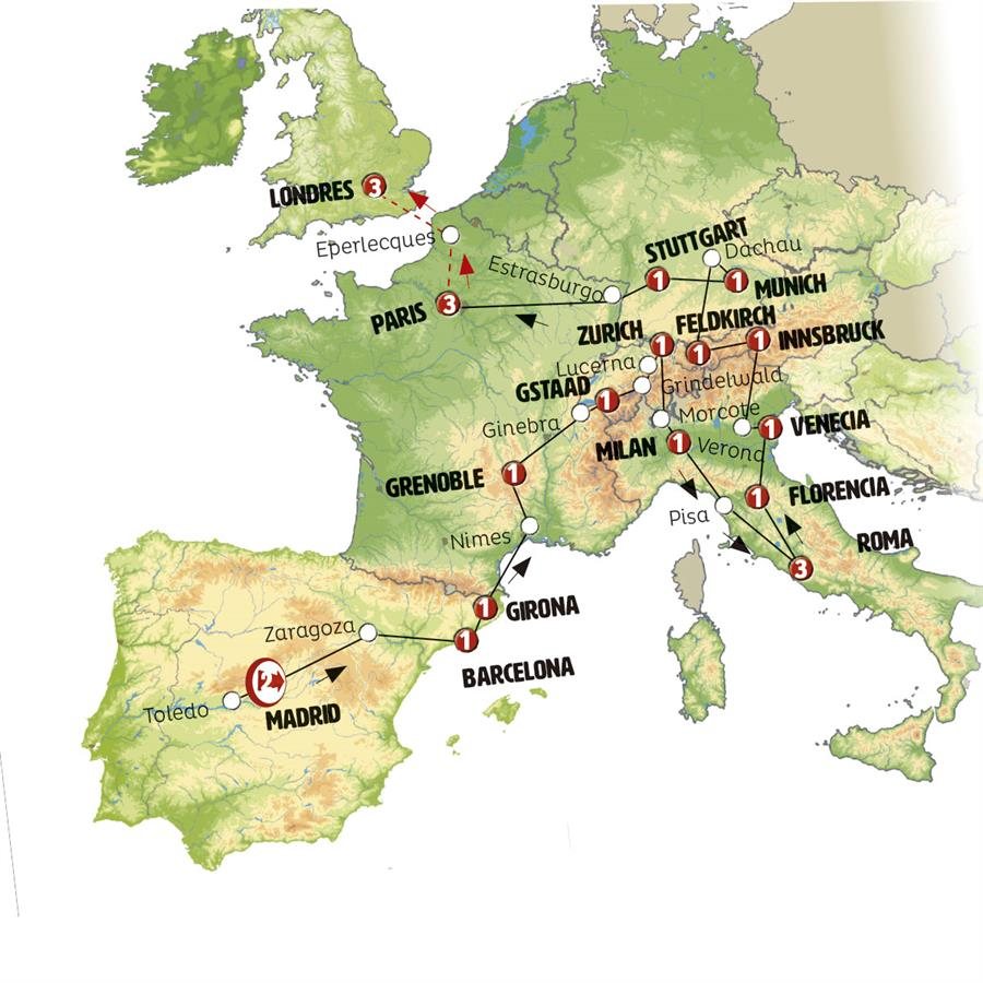 La etapa de hoy tiene paisajes bellísimos de alta montaña. No olvide su ropa de invierno, subimos en teleférico a uno de los puntos más espectaculares de SUIZA donde podrá ver el hielo y la nieve todo el año. Incluimos la subida en teleférico a GLACIER 3000, podrá caminar en el puente colgante sobre el vacío entre dos cumbres de montaña, entrar en la Catedral de Hielo o “jugar” en el Fun Park. Parada en INTERLAKEN y tiempo para almorzar. Entre muy pintorescos lagos continuamos a LUCERNA, una de las ciudades más bellas de Suiza. Continuamos a ZURICH, un tiempo para pasear en el centro antes de ir al hotel.Nota: en ocasiones, por razones de causa mayor meteorológicas como lluvias o fuertes vientos, el teleférico al Glacier 3000 podrá no opera. En ese caso, se ofrecerá una experiencia alternativa de paisajes alpinos igualmente bella.