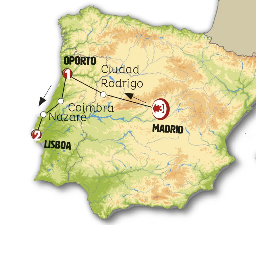 Salida temprano de Madrid hacia Castilla. Efectuamos una breve parada en el Mirador de los 4 postes con su vista sobre las magníficas murallas de ÁVILA. Casi en la frontera con Portugal paramos en CIUDAD RODRIGO, un paseo para conocer su catedral, muralla y calles medievales. Continuamos hacia Portugal OPORTO. Tras la llegada realizaremos una travesía de 50 min por el río Duero en un "Rabelo", embarcación tradicional portuguesa, para descubrir la ciudad desde la bella ribera del río. Tiempo libre posteriormente para pasear por el animado barrio medieval de la Ribeira, de angostas calles bordeadas de antiguas casas de mercaderes y cafés antes de dirigirnos al hotel.Nota: Si el número de pasajeros entre Madrid y Oporto es muy reducido podrá realizarse este tramo en avión, anulándose en este caso la parada en Ciudad Rodrigo.