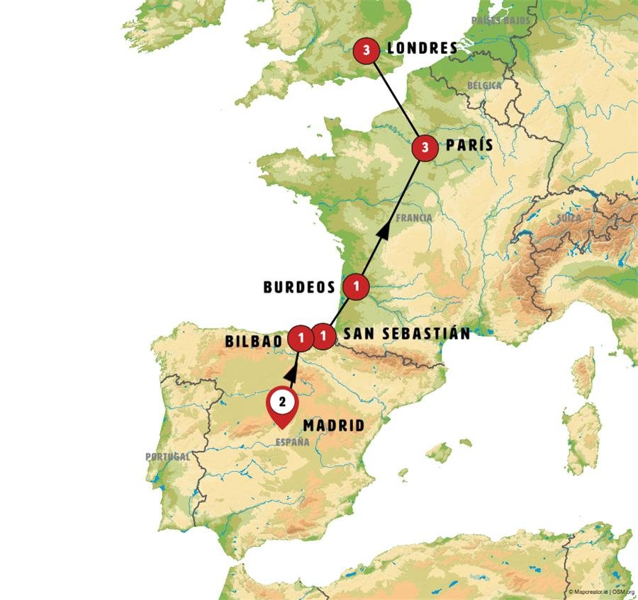 Tras el desayuno, con el guía local, realizaremos una visita de Bilbao donde destaca el Museo Guggenheim con su impactante arquitectura exterior, el casco antiguo o núcleo medieval con sus calles llenas de vida y la catedral. Tiempo libre para pasear y almorzar. Recomendamos el Mercado de La Ribera para almorzar que ofrece puestos con la típica gastronomía vasca en una estructura parecida a un barco ubicada frente al río. Tras la hora del almuerzo saldremos a GUERNICA, conocido por ser el lugar donde se libró una de las peores masacres de la Guerra Civil Española recordada en la pintura de Pablo Picasso. Acá se encuentra el árbol de Guernika, bajo cuyas ramas se otorgó autonomía al País Vasco en la Edad Media. Seguimos hacia HONDARRIBIA (Fuenterrabía), con sus playas, sus murallas, su ambiente marinero y su centro histórico donde sorprende el trazado cuadriculado de sus calles angostas y adoquinadas. Tiempo en el casco histórico para pasear y cenar. Continuación a SAN SEBASTIAN, llegada al final del día. Nuestro hotel se encuentra normalmente en lo alto del Monte Igueldo desde donde podrá contemplar una de las vistas más hermosas de esta elegante ciudad iluminada.