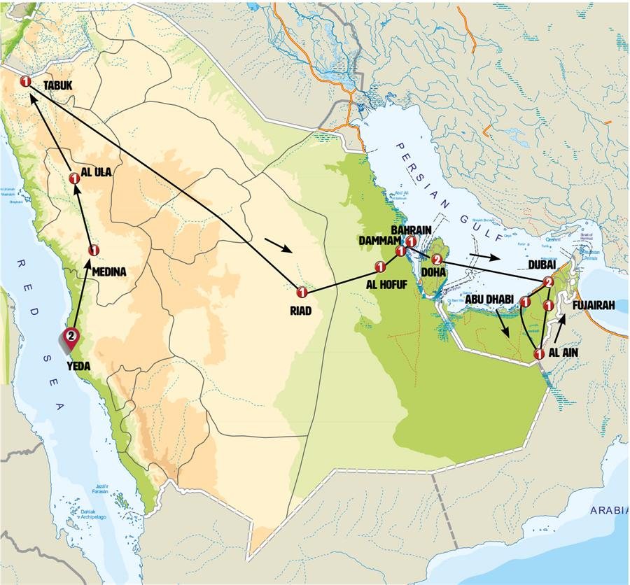 Tras el desayuno visitamos la ciudad. Conocemos el Ibrahim Palace, fortaleza histórica (Patrimonio de la Humanidad) dominada por su blanca mezquita, construido en el año 1556 por los otomanos. Tras ello conocemos “House of Allegiance” que nos muestra un pequeño palacio característico del oasis. Nos acercaremos hasta la animada zona donde se levanta el Palacio de Mulhaires, con sus numerosos restaurantes, tiendas y parques donde acude la población local. Posteriormente continuamos por el oasis hacia a AL QARA, un lugar histórico y zona paisajística espectacular de laberintos, mini-desfiladeros y cuevas en la montaña, que le parecerá como si penetrase en la montaña. La temperatura es constante durante todo el año la temperatura y ronda los 25 grados. Aprovecharemos también para conocer su museo “Tierra de civilizaciones” que nos describe la historia de la zona.Por la tarde seguimos nuestra ruta hacia el Golfo Persico. Nos sorprenderá la moderna ciudad de DAMMAM, capital provincial de casi un millón de habitantes. Antes de llegar pararemos en el impresionante recinto de Ithra y su modernísimo King Abdulaziz Center for World Culture- un lugar con forma de roca, arquitectónicamente muy llamativo y que dispone de zonas de ocio, museos y biblioteca. Ya en Dammam, junto al mar, haremos una breve parada para ver la torre del agua de Khobar. Siguiendo su moderno paseo marítimo llegaremos al Heritage Village, que con forma de fortaleza junto al mar nos invita a conocer la civilización saudí. Aquí conocemos su pequeño museo de objetos antiguos, incluyendo su colección de automóviles históricos. Cena incluida. Nota: en el momento de efectuarse este itinerario el Palacio Ibrahim se encontraba cerrado por restauración. Durante el tiempo que se mantenga cerrado se conocerá desde el exterior.