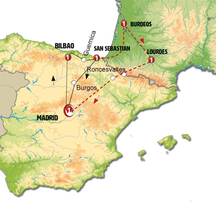 Tras el desayuno, con el guía local, realizaremos una visita de Bilbao donde destaca el Museo Guggenheim con su impactante arquitectura exterior, el casco antiguo o núcleo medieval con sus calles llenas de vida y la catedral. Tiempo libre para pasear y almorzar. Recomendamos el Mercado de La Ribera para almorzar que ofrece puestos con la típica gastronomía vasca en una estructura parecida a un barco ubicada frente al río. Tras la hora del almuerzo saldremos a GUERNICA, conocido por ser el lugar donde se libró una de las peores masacres de la Guerra Civil Española recordada en la pintura de Pablo Picasso. Acá se encuentra el árbol de Guernika, bajo cuyas ramas se otorgó autonomía al País Vasco en la Edad Media. Seguimos hacia HONDARRIBIA (Fuenterrabía), con sus playas, sus murallas, su ambiente marinero y su centro histórico donde sorprende el trazado cuadriculado de sus calles angostas y adoquinadas. Tiempo en el casco histórico para pasear y cenar. Continuación a SAN SEBASTIAN, llegada al final del día. Nuestro hotel se encuentra normalmente en lo alto del Monte Igueldo desde donde podrá contemplar una de las vistas más hermosas de esta elegante ciudad iluminada.