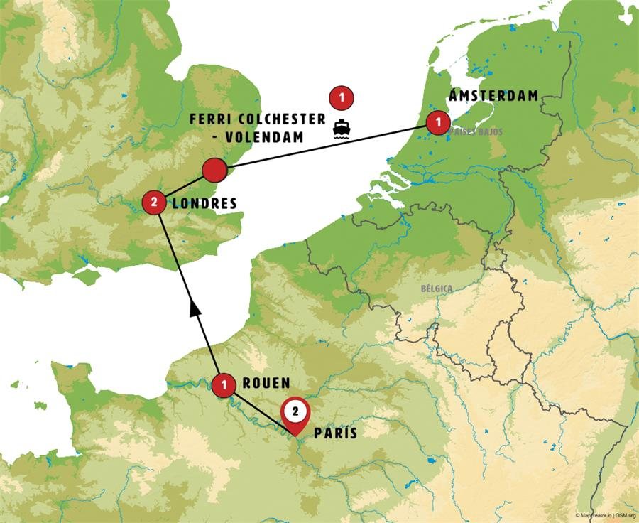 Por la mañana vamos al Museo Británico, uno de los principales y más antiguos museos del mundo, donde podremos ver las huellas de culturas de toda la tierra. Tiempo libre. A la hora del almuerzo daremos un traslado al barrio de CAMDEN, un distrito famoso por sus tiendas y mercados de sus calles en las que podremos ver objetos de culturas de todo el mundo y donde podrá almorzar en alguno de los múltiples pequeños restaurantes y puestos de comida de este popular barrio.Sobre las 16.00 saldremos hacia COLCHESTER, conocida como la más antigua ciudad de Inglaterra. Tiempo para pasear. Embarcamos posteriormente en Harwich en moderno ferry; travesía nocturna en camarotes con baño. Cena incluida.Nota importante: Debido a que el ferry utilizado tiene un número limitado de camarotes, en algunas ocasiones la etapa podrá sufrir modificaciones y se podrá ir desde Londres hasta Amsterdam bien en ferry diurno pernoctado en Amberes o bien en tren o avión a Amsterdam.