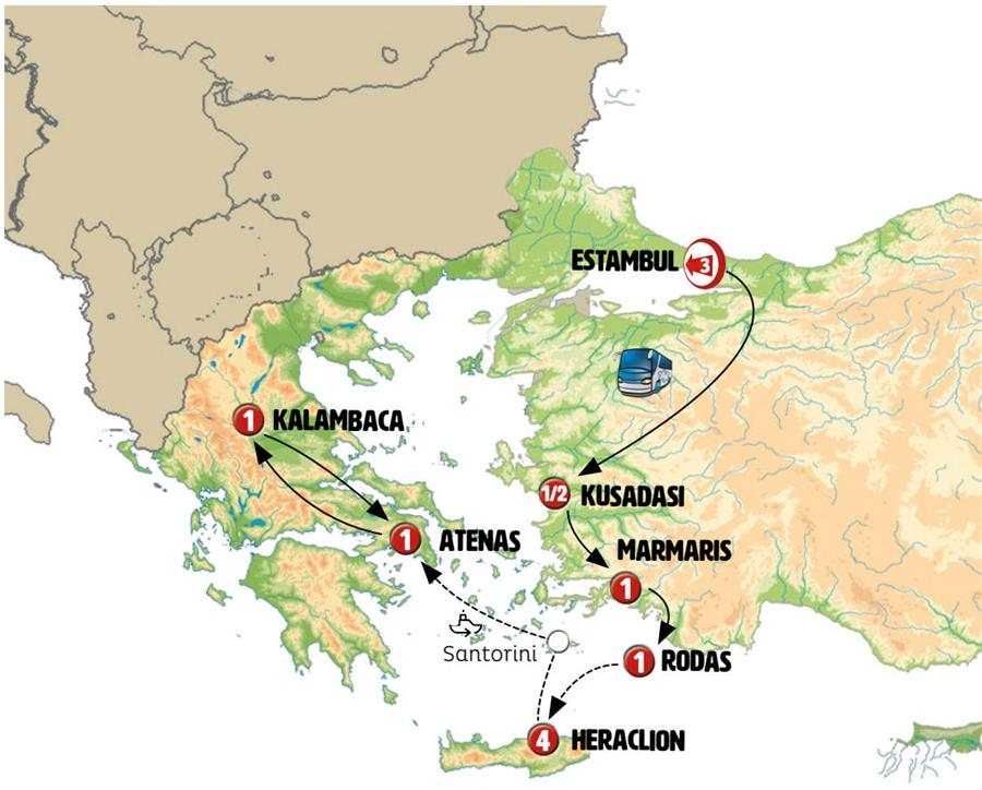 Traslado a primera hora al puerto. Embarcamos en un ferry rápido hacia la isla de SANTORINI, llegada entre las 09.00 hrs y las 10.00 hrs.- en autobús , entre bellísimos paisajes vamos a OIA, sin duda la más espectacular población de la isla, callecitas blancas llenas de vida, inmensas vistas sobre acantilados, restos de castillo y molinos de viento. Tiempo para pasear y almorzar. Tras ello conocemos THIRA, la capital de la isla; los que lo deseen pueden bajar en teleférico o burro al puerto a donde llegan los cruceros. Continuación posteriormente al puerto de ferris para embarcar en ferry rápido, con salida sobre las 15.30 hrs. Llegada a ATENAS a medianoche.-Nota muy importante: De noviembre a mediados de abril NO VISITAREMOS LA ISLA DE SANTORINI por no operar el ferry rápido de Heraclión a Santorini. En ese periodo realizaremos en avión el trayecto de Heraclión a Atenas.