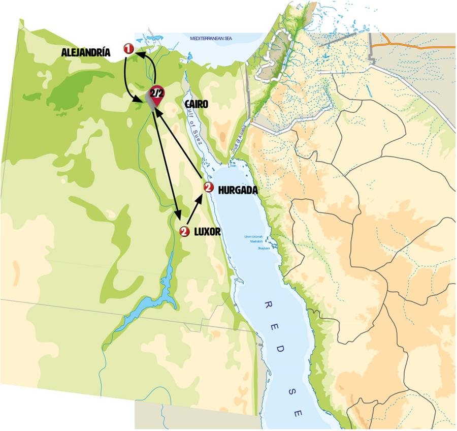 Siguiendo el Mar Rojo viajamos hacia uno de los más impresionantes monasterios coptos, el Monasterio de San Antonio, uno de los monasterios más antiguos de la cristiandad que data del siglo IV, época en que los monjes comenzaron a asentarse en las cuevas y acantilados escondidos a los pies de las montañas del Mar Rojo . Este monasterio se considera uno de los lugares más sagrados de la iglesia copta en Egipto. Visitaremos el MONASTERIO DE SAN ANTONIO, también amurallado con sus numerosos edificios y viviendas de adobe, cuyo ambiente parece detenido en el tiempo. La iglesia de San Antonio, construida sobre la tumba del santo, alberga magníficos murales coptos del siglo XIII. Almuerzo incluido en ruta.Tras este emotivo lugar viajamos a EL GALALA, nueva ciudad que Egipto está edificando en el desierto que nos sorprenderá. Iremos en primer lugar al resort de lujo ubicado junto al Mar Rojo, con su puerto deportivo y su parque acuático; desde donde incluimos la subida en teleférico (el de mayor desnivel de África) a el Galala, ciudad magníficamente diseñada cuya construcción se inició en 2015 y que alberga una gran universidad.Continuación a EL CAIRO.- Llegada al final del día.