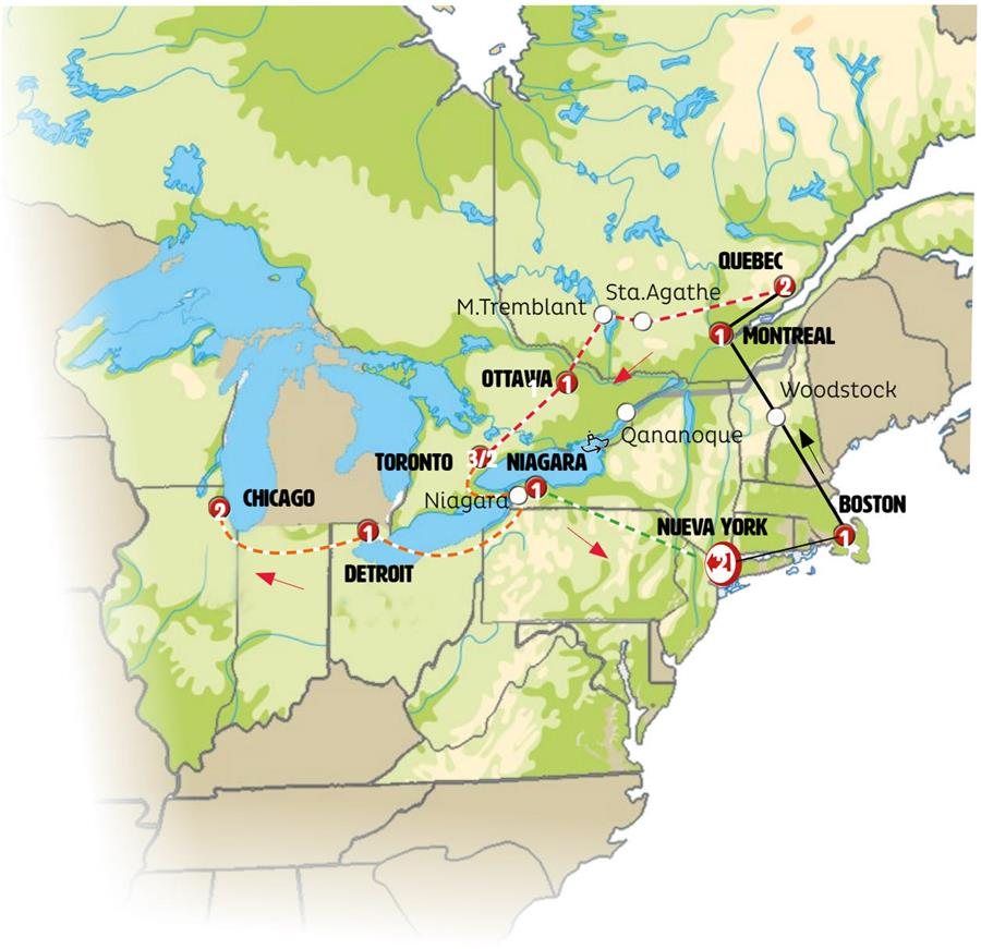 Después del desayuno, cruzaremos dos de los estados con naturaleza más espectacular del Este Americano: New Hampshire y Vermont. Pararemos en WOODSTOCK, (Vermont) precioso pueblecito con sus restauradas casas Georgianas. Cruzaremos la frontera de Canadá, para llegar a Montreal. Alojamiento.