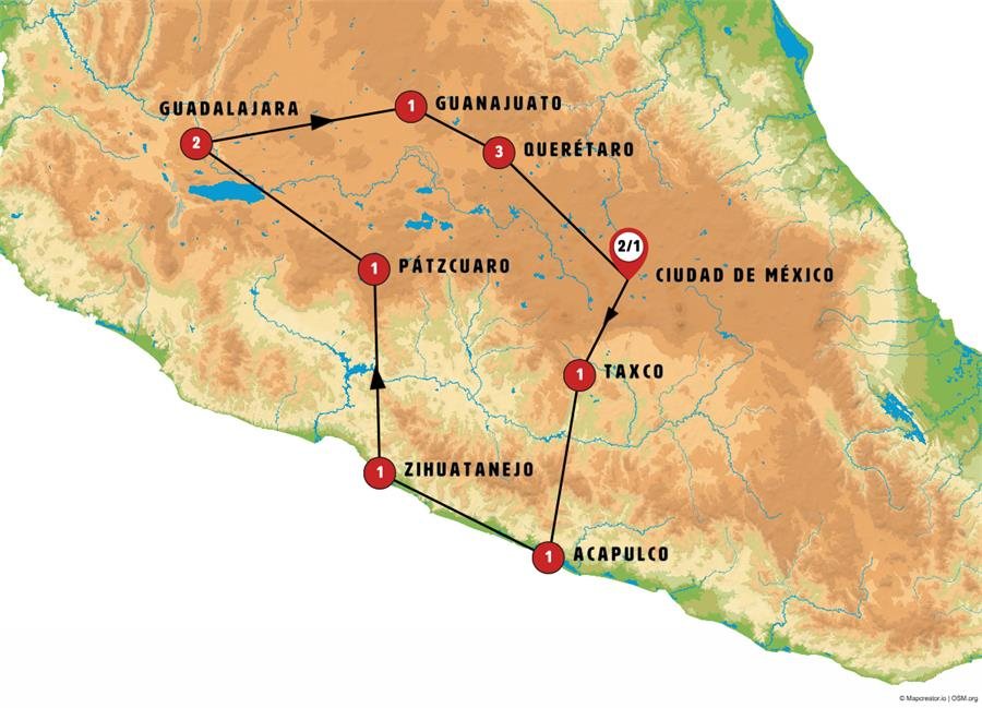 Tras el desayuno salimos de Ciudad de México hacia el estado de MORELOS,TEPOZTLAN , pueblo mágico, conocido como destino espiritual, de bienestar, en un entorno de belleza natural, ubicado junto a gran cerro verde que tiene pequeña pirámide (no la visitaremos). Tiempo para pasear por sus calles o mercado de artesanías. Continuamos a CUERNAVACA, la capital del estado de Morelos, conocida como "La Ciudad de la Eterna Primavera". Fundada en la época prehispánica, esta ciudad ha sido un refugio para la nobleza azteca y más tarde para la élite colonial española. Podrá conocer el Palacio de Hernán Cortés, la catedral y pasear por sus jardines y parques. Tiempo para almorzar. Pasamos al estado de Guerrero, TAXCO, uno de los Pueblos Mágicos mas bonitos de México, rodeado de montañas, con su belleza colonial, sus calles empedradas, sus casas blancas y tradición en la platería. Tiempo para visitar la ciudad y alojamiento.Nota: En ocasiones pueden existir dificultades de alojamiento en TAXCO, en estos casos podríamos salir de TAXCO al final de la tarde para alojarnos en Chilpancingo