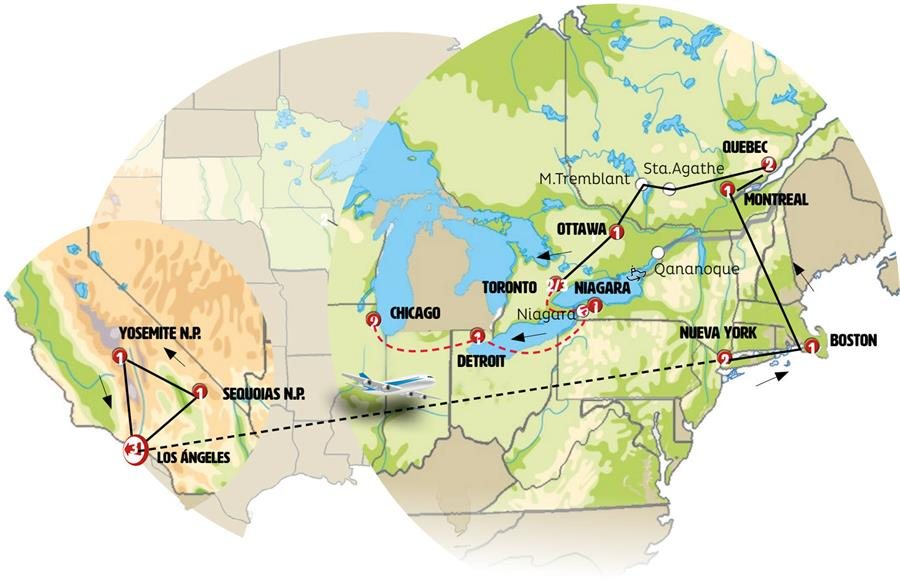 Después del desayuno, visita panorámica de la ciudad de QUEBEC en la mañana, destacando entre sus más importantes puntos El Chateaux Frontenac, la Place Royale, Sainte Anne de Beaupré y la Citadelle. En la tarde, tiempo libre donde sugerimos conocer las cataratas de Montmorency.